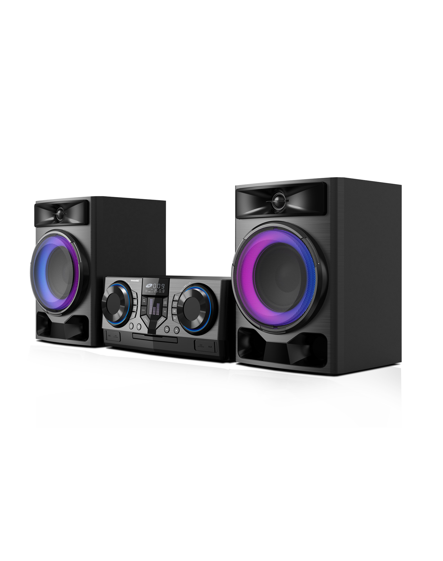 Con un potentes subwoofers de 8" que ofrece graves profundos y nítidos. Además, incorpora en ellos efectos de luces LED dinámicas que se sincroniza con el ritmo de la música.