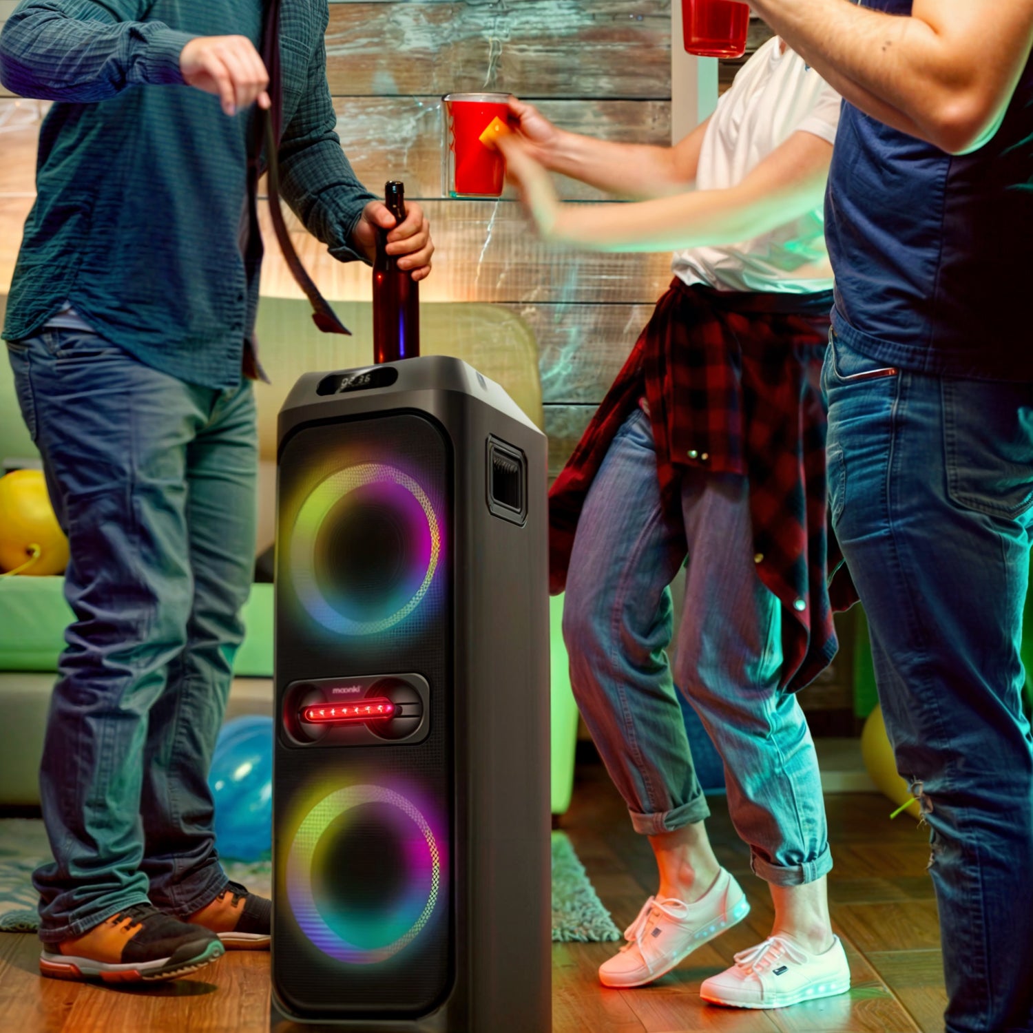 Equipada con un par de woofers de 8" que desatan un potente sonido envolvente, junto con un cautivador efecto de iluminación LED dinámico. Además, su conectividad Bluetooth 5.0 y la función TWS permiten una experiencia musical sin esfuerzo, ofreciendo una libertad total para disfrutar de la música.