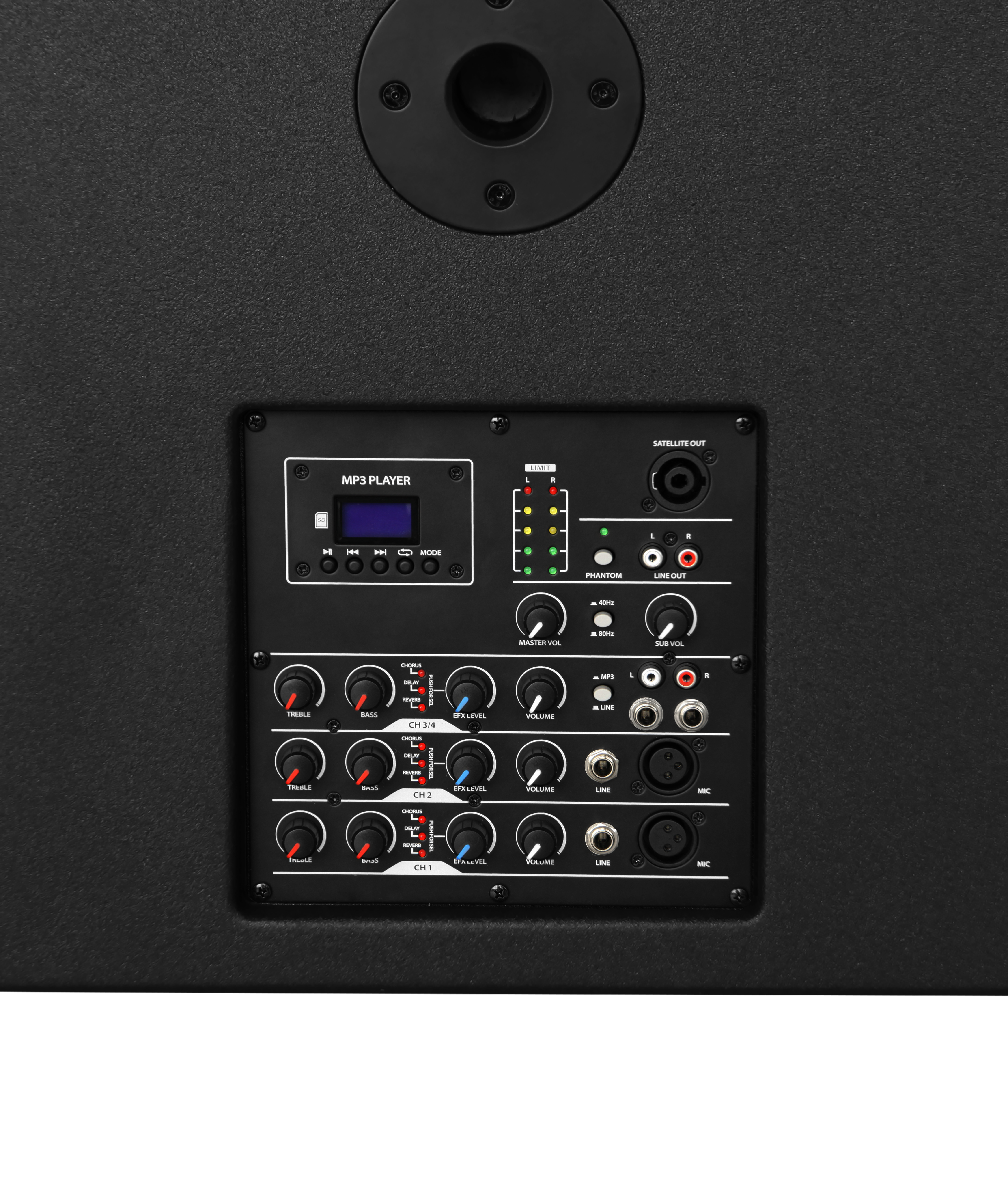 El sistema está equipado con una placa amplificadora de clase D, que es conocida por su eficiencia energética y capacidad para entregar un sonido limpio y potente. La tecnología de amplificación de clase D minimiza las pérdidas de energía y reduce el calor generado, lo que permite una operación más eficiente y duradera.