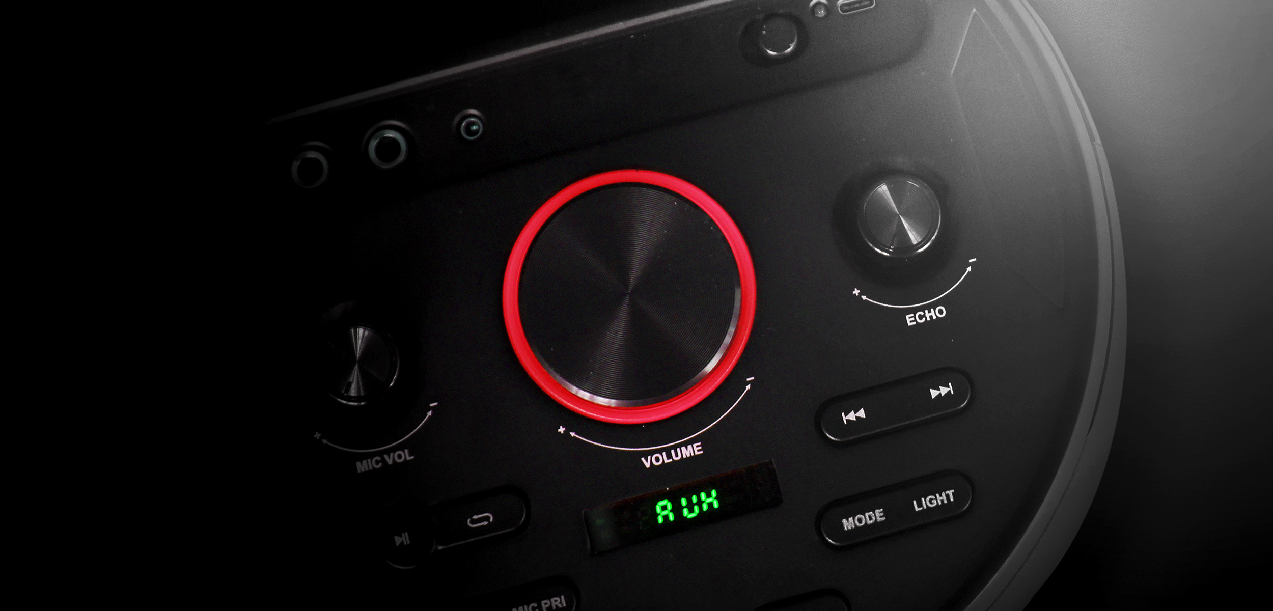 Sus dos imperdibles woofers de 6.5¨con anillos LED rojo y un tweeter de 1¨ potencian a la perfección los sonidos graves y agudos respectivamente. Además ofrece una entrada auxiliar.