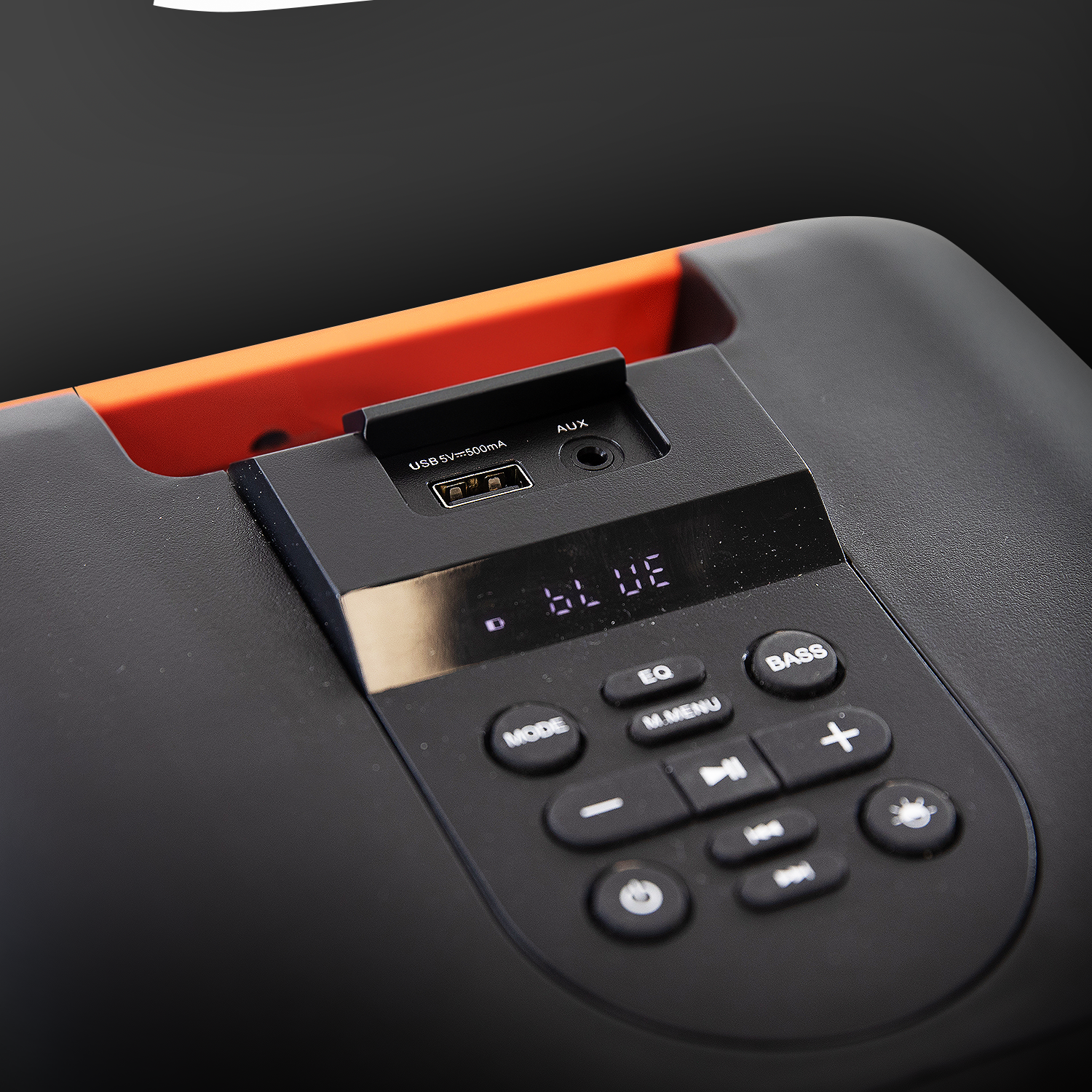 Desde su acabado panel de control de diseño totalmente amigable es posible regular las funciones y efectos de luz LED dinámicos que este Party Speaker dispone.