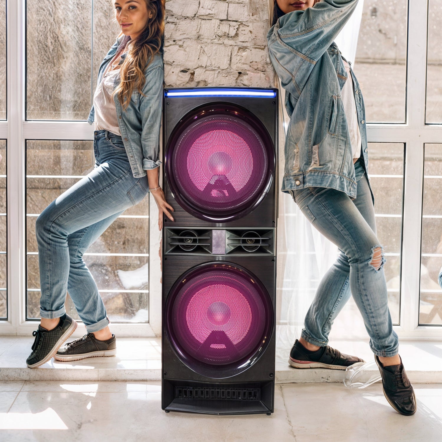 Configuração bidirecional através de seu duplo woofer de 12", ambos com iluminação em toda a sua superfície e controle de efeitos de luz profissionais.