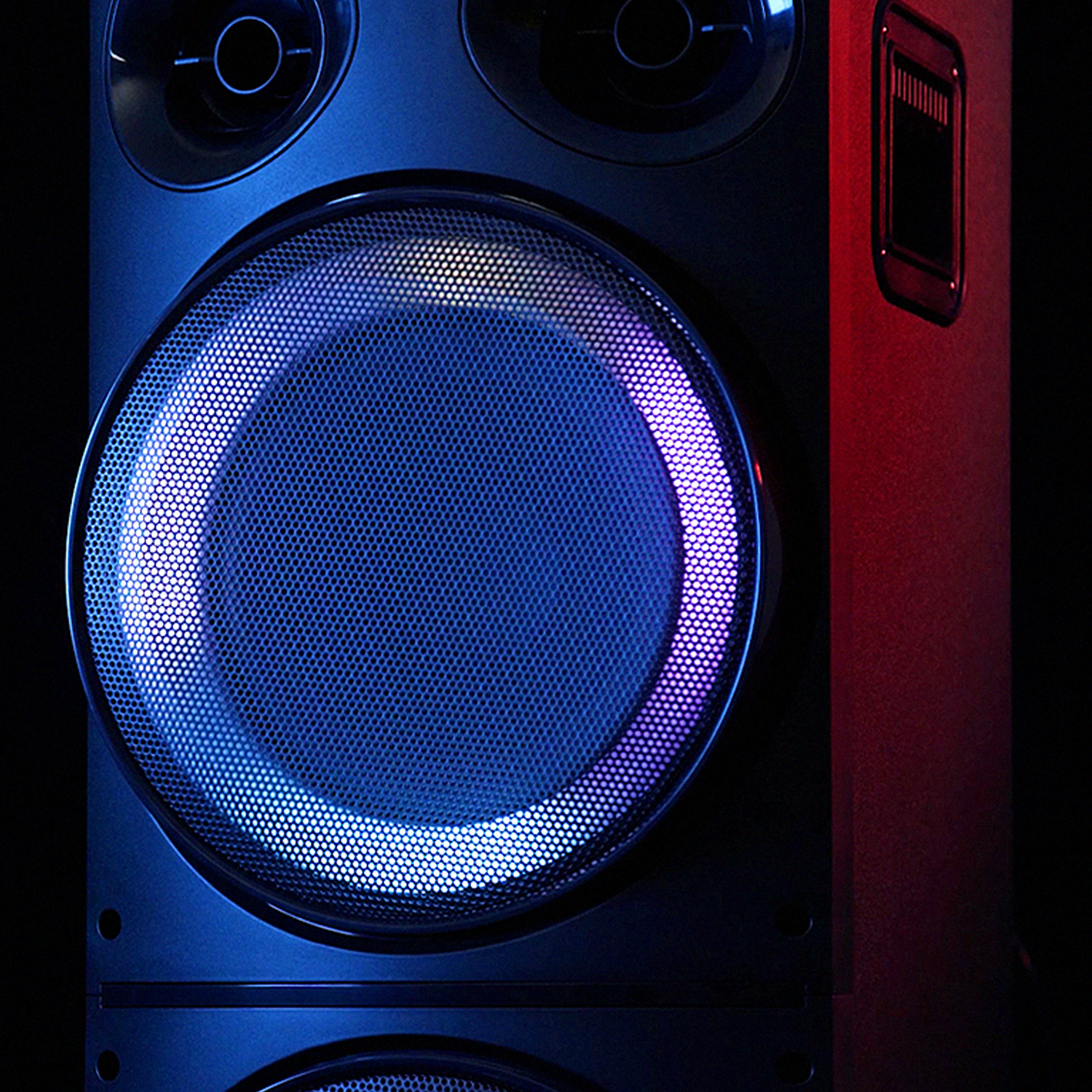 Seu duplo woofer adiciona um revestimento de anéis de luz LED com efeitos dinâmicos ajustáveis que você pode mudar quando quiser a partir de seu painel de controle localizado na parte superior. Algo mais?